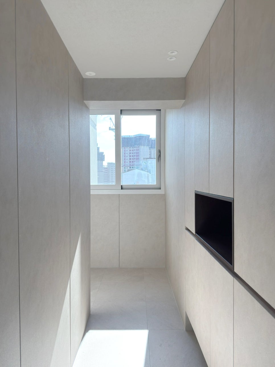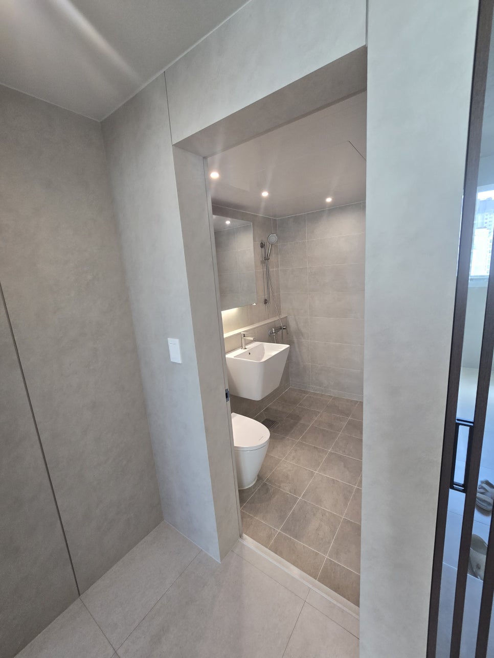 거실 전체가 통일된 그레이 톤으로 마감되어 고급스러우면서도 모던한 분위기를 연출합니다.